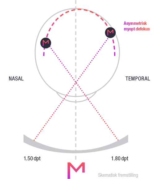 Den myope nethinde er stejlere nasalt end temporalt. For at yde fysiologien retfærdighed og få den størst mulig behandlingssucces, har SMYLE brilleglas i det temporale område en højere plusvirkning. Sådan opstår et stærkere defokus i det nasale nethindeområde.